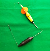 カゴにエサを入れ、片手で道糸を持ち、一方の手で浮きを下側(カゴ側)に押し込み、ガックンと音がすればセッティングOKです。