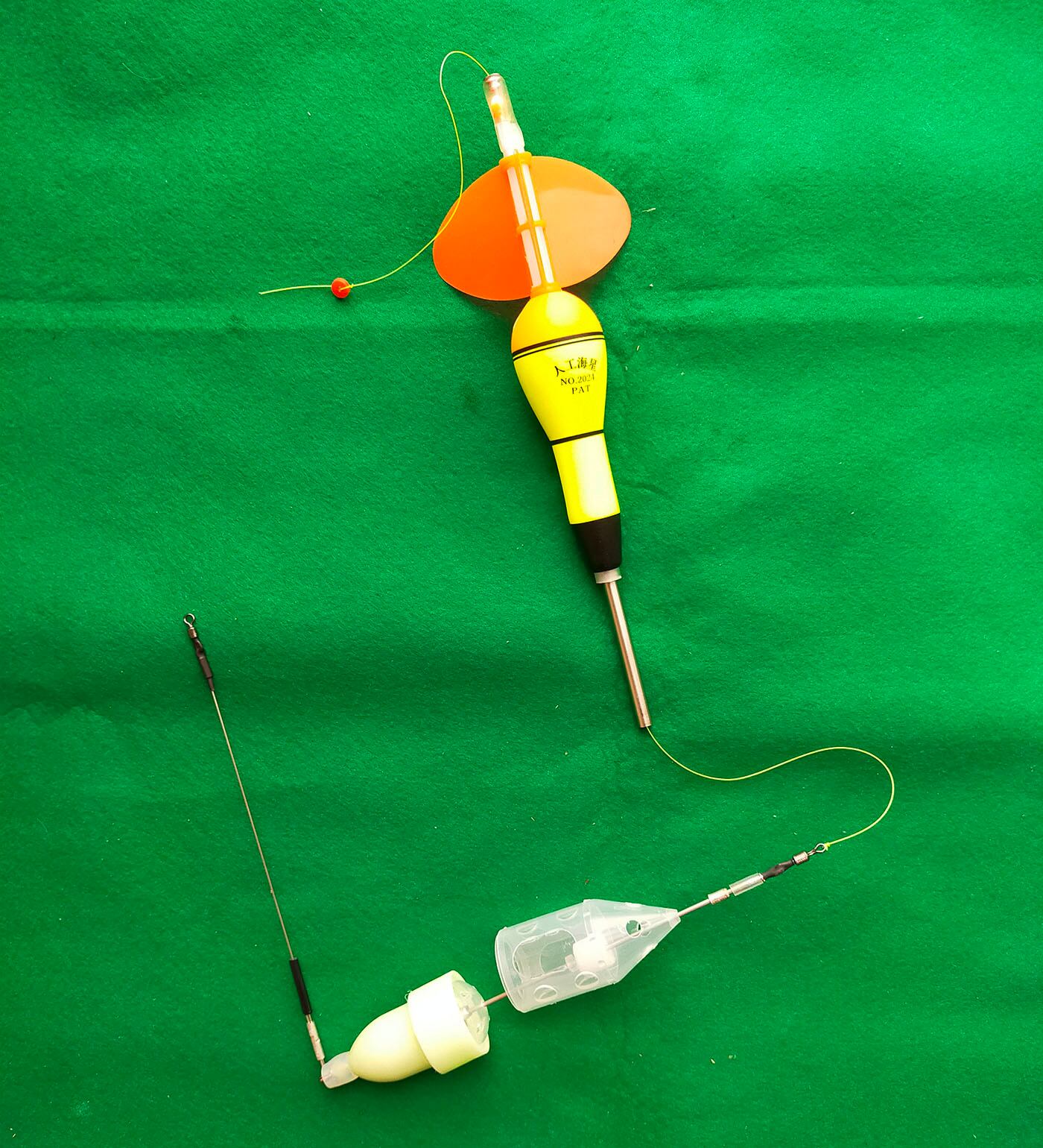 カゴにエサを入れ、片手で道糸を持ち、一方の手で浮きを下側(カゴ側)に押し込み、ガックンと音がすればセッティングOKです。